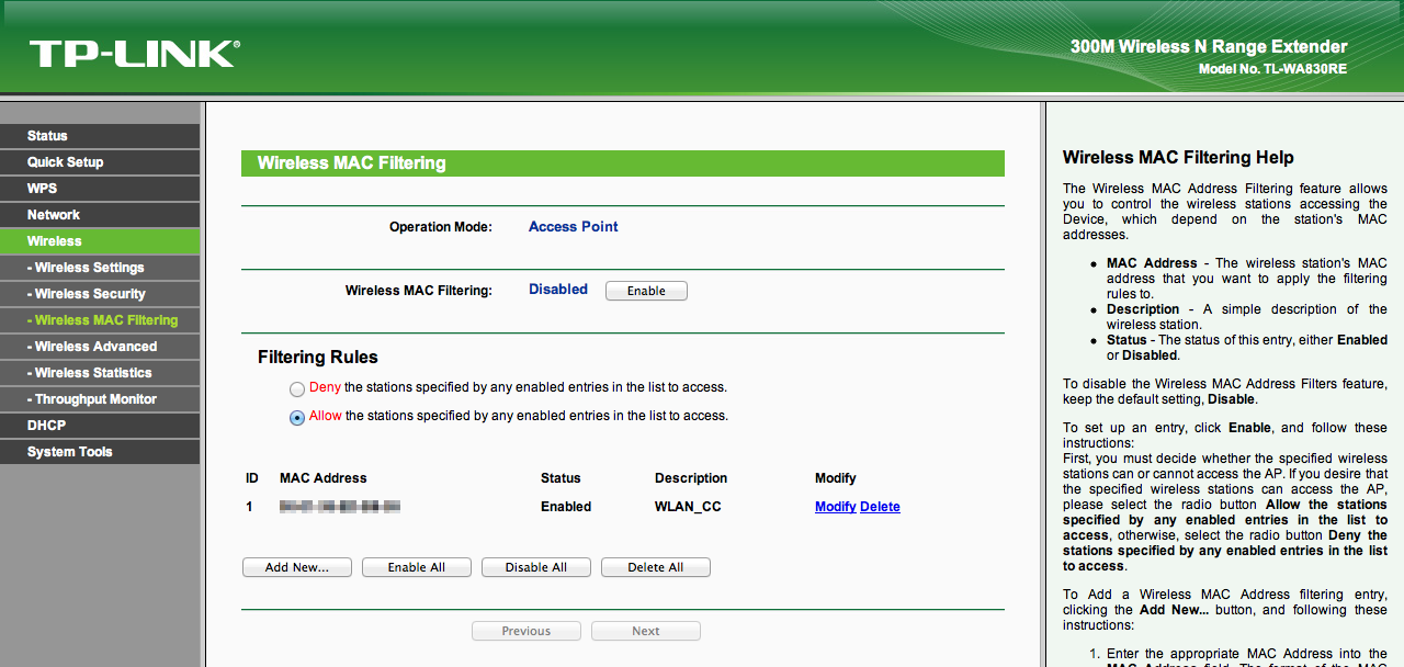 Wireless Mac Filtering. En el apartado de
